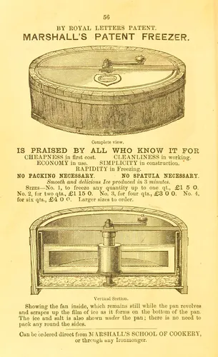 The Marshall’s Patent Freezer, designed by Agnes and patented by Agnes’ husband, Alfred Marshall, could freeze a pint of ice cream in less than five minutes.
