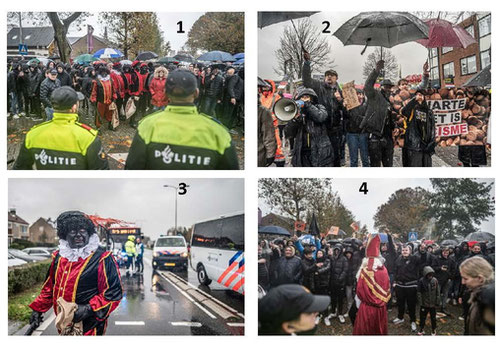 Ze zijn niet onopgemerkt gebleven. Overal komen auto’s en bestelbusjes met daarin als Zwarte Piet verklede mannen tevoorschijn. Ze steken hun middelvingers op. Een kakofonie van getoeter klinkt. Ook op de weg verschijnen als Zwarte Piet verklede mannen. Een van hen, met in zijn rechterhand een juten zak, maakt met zijn linkerhand het gebaar alsof hij iemands keel doorsnijdt. Eieren kletteren tegen de busruiten. ‘Pas op!’, waarschuwen de actievoerders elkaar wanneer opnieuw een voorwerp wordt geslingerd.