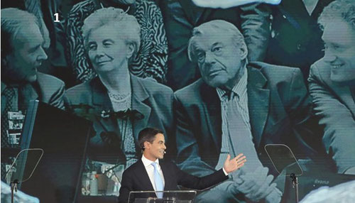 Foto 1 - Partijleider Rob Jetten tijdens het congres van D66 in de Brabanthallen op 4 oktober in Den Bosch. Op de achtergrond een historische foto van partijprominenten Jan Terlouw, Els Borst, Hans van Mierlo en Thom de Graaf. Bron ANP / Branko de Lang.
